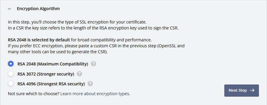 Encryption Algorithm : 알고리즘 보안 강도를 기본으로 "RSA 2048"로 선택되어 있습니다. 그대로 'Next Step'을 누릅니다.