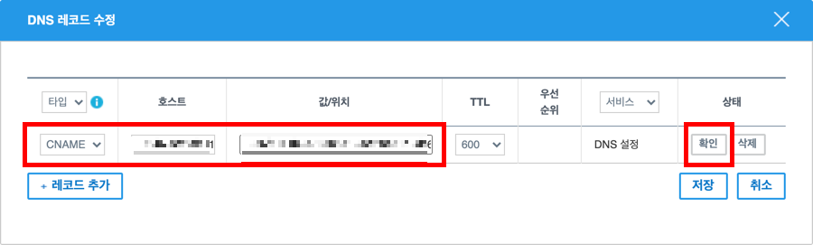 DNS 레코드 수정 화면에서 '레코드 추가' 버튼을 누르고 다음과 같이 입력합니다.