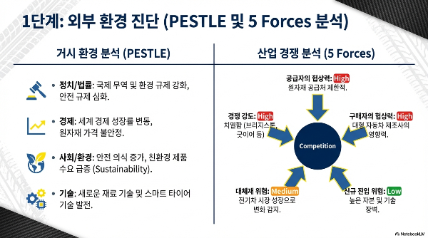 - PESTLE 분석: 환경 규제 강화와 친환경 타이어 수요 증가라는 기회 요인을 포착했습니다.